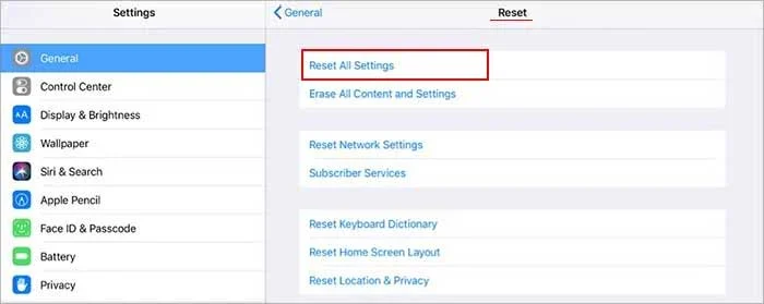 Às vezes, redefinir as configurações de rede do iPad pode não ser suficiente para resolver o problema. Você pode redefinir todas as configurações nesse caso para definir todas as configurações como padrão. Para fazer isso,
