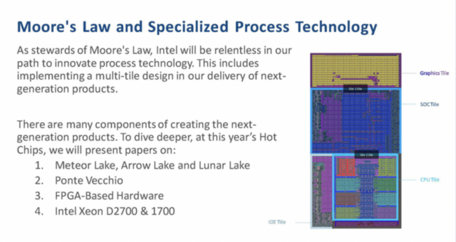 O os slides são rotulados com emblemas Intel e Hot Chips, indicando que foram apresentados no recente simpósio de silício. Eles foram desenterrado por Wccftech, e se parecem com os tipos de slides que seriam exibidos em uma conferência. Já sabíamos algumas dessas informações, incluindo as atribuições de blocos do Meteor Lake. Ele será construído em um novo processo de 7 nm apelidado de Intel 4. Deveria estar em teste agora, com produção de alto volume começando no início de 2021. Originalmente era suposto para vir depois de Alder Lake, mas foi adiado em cerca de um ano. Isso fez com que a Intel apresentasse uma solução alternativa, que chamou de Raptor Lake. Pat Gelsinger já disse no e registre que os testes da Intel 4 estão indo bem.