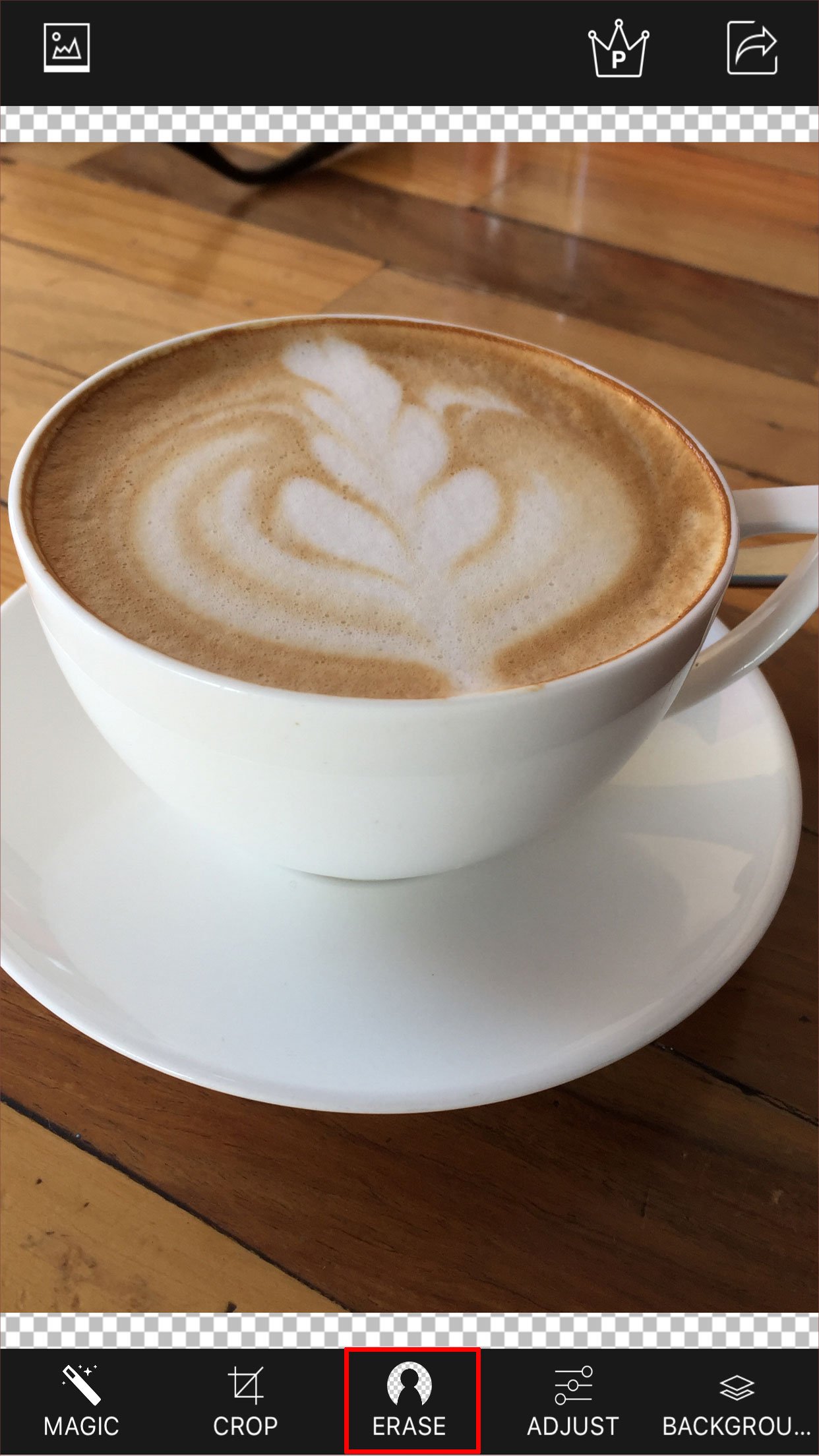 Selecione a imagem que deseja tornar transparente. Toque em Apagar na barra de menu inferior.