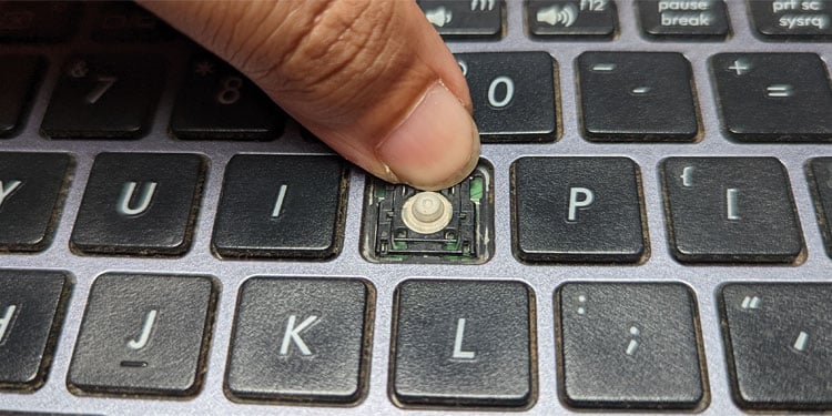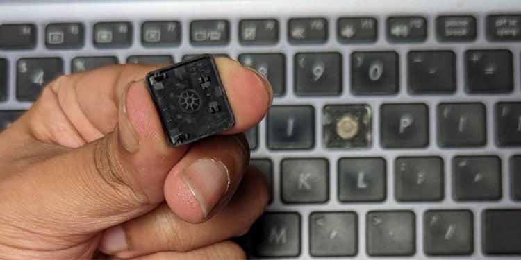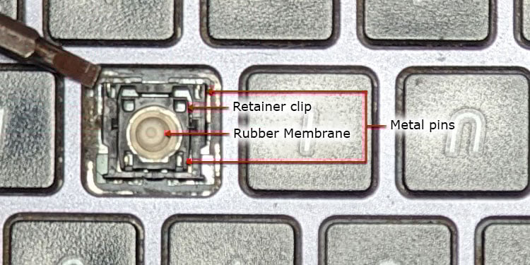 A maioria dos laptops vem com teclados de membrana. Portanto, listamos as etapas para consertar teclas quebradas enquanto consideramos os teclados de laptop de membrana. Eles consistem em uma tampa de tecla, clipes de retenção para manter a tampa de tecla no lugar e uma membrana de borracha que realmente pressiona o botão abaixo da tecla.
