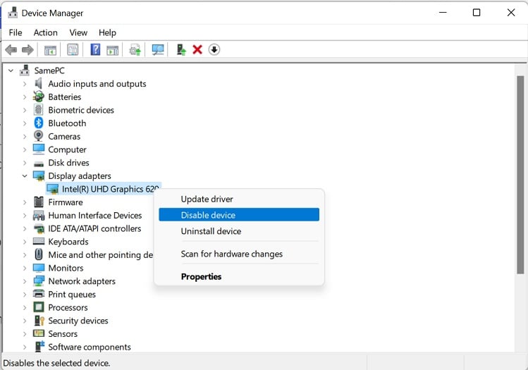 devmgmt.mscEm seguida, expanda o menu suspenso Adaptadores de vídeo e clique com o botão direito do mouse no driver. Aqui, escolha Desativar dispositivo e verifique se os problemas estão nos drivers de vídeo.