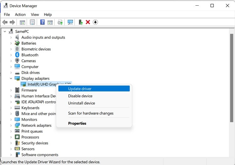 Se você não estiver mais recebendo a mensagem de erro, clique com o botão direito do mouse no adaptador novamente e selecione Atualizar driver.
