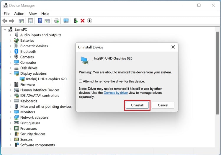 Em seguida, clique no botão Desinstalar e reinicie o PC. Assim que o computador inicializar, os drivers necessários serão reinstalados.