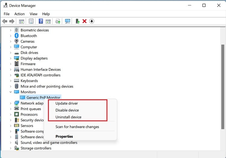 Em seguida, tente desabilitar o dispositivo primeiro para ver se isso está causando o problema. Em seguida, use o mesmo método anterior para atualizar e reinstalar o driver do monitor.