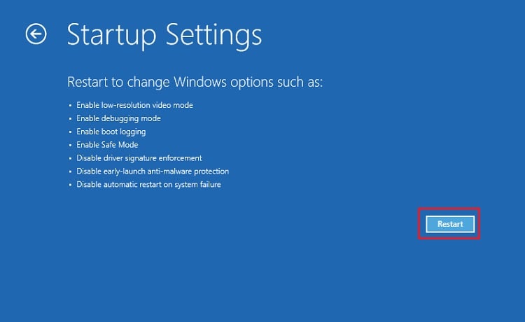 Em seguida, clique no botão Reiniciar para iniciar a janela de configurações de inicialização.