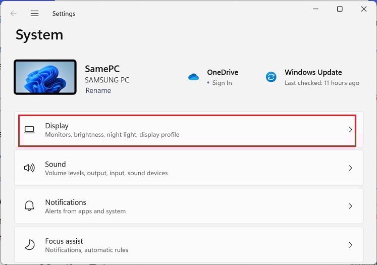 Use a tecla de atalho Windows + I para iniciar Configurações e navegue até Exibição.