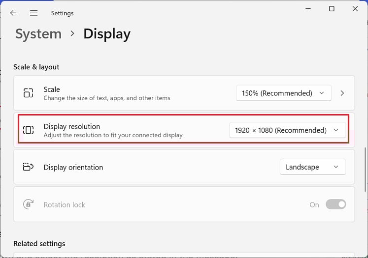 Na seção Escala e layout, encontre as configurações de resolução de vídeo.