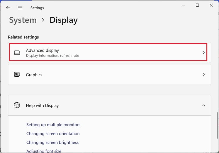 Expanda a lista suspensa e selecione a resolução conforme indicado na mensagem. Em seguida, vá para a opção Exibição avançada na seção Configurações relacionadas.