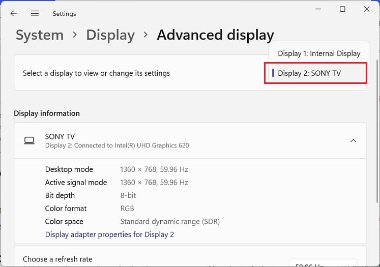 Em Informações de exibição, expanda a lista suspensa Escolher uma taxa de atualização e selecione o Hz conforme indicado na mensagem.