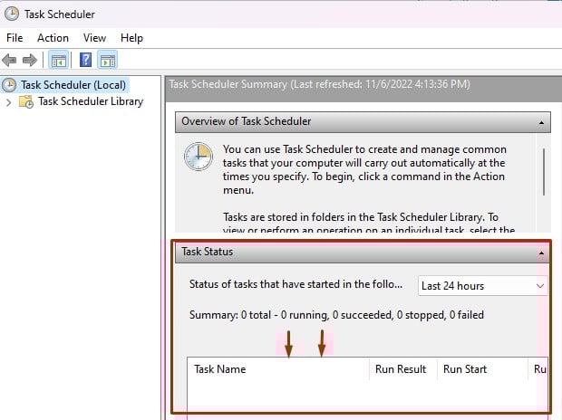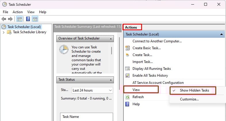 Pressione Windows +’R’e digite taskschd.msc para abra o Agendador de Tarefas.Clique com o botão direito do mouse no menu Biblioteca do Agendador de Tarefas no painel esquerdo. Clique em Exibir e selecione Mostrar tarefas ocultas.