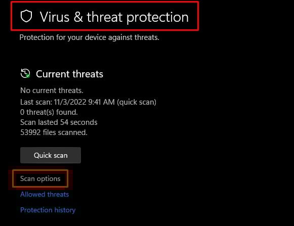 Pressione Windows +’R’e digite ms-settings: windowsdefender para executar a Segurança do Windows. Vá para Proteção contra vírus e ameaças e escolha Opções de verificação.
