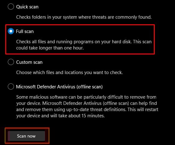 Se essa mensagem de erro aparecer , você terá que realizar uma verificação completa de vírus do seu sistema usando um software antivírus confiável ou o programa Windows Defender para remover o malware.