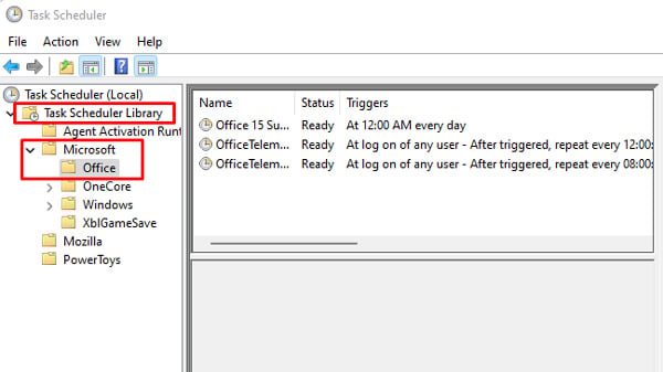 Abra o Agendador de Tarefas.Clique duas vezes em Biblioteca do Agendador de Tarefas para expandi-lo. Novamente, clique duas vezes em Microsoft e selecione Escritório.