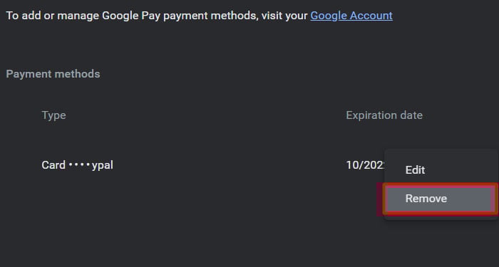 Para pagamento métodos:Clique em Formas de pagamento. Clique no ícone de três pontos verticais ao lado da forma de pagamento salva. Selecione Remover.