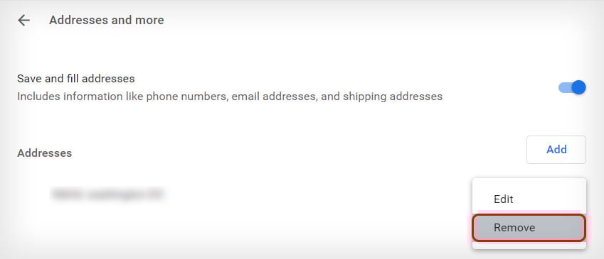 Para endereços e mais:Clique em Endereços e mais. Clique no ícone de três pontos verticais ao lado o endereço salvo e selecione Remover.