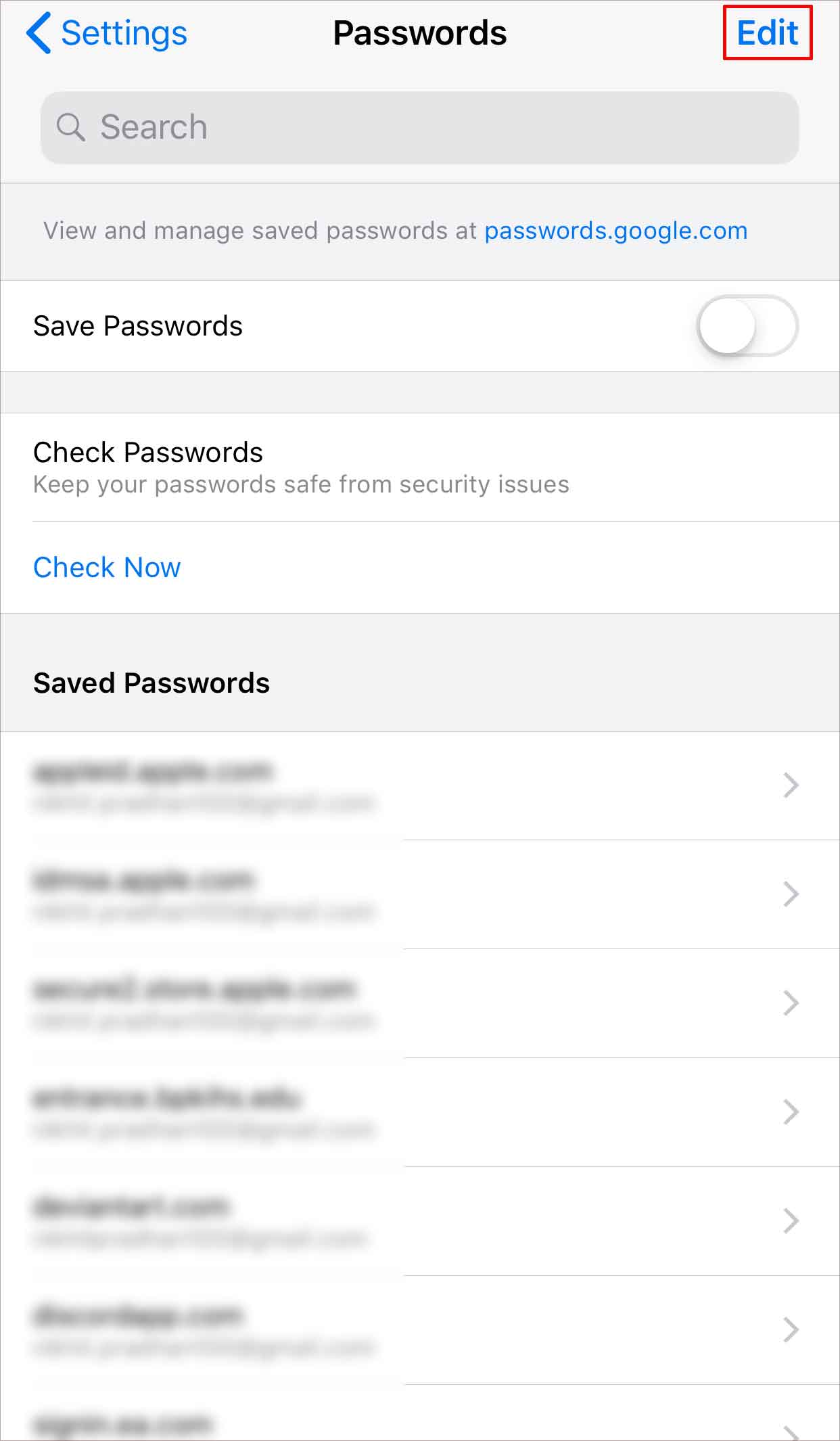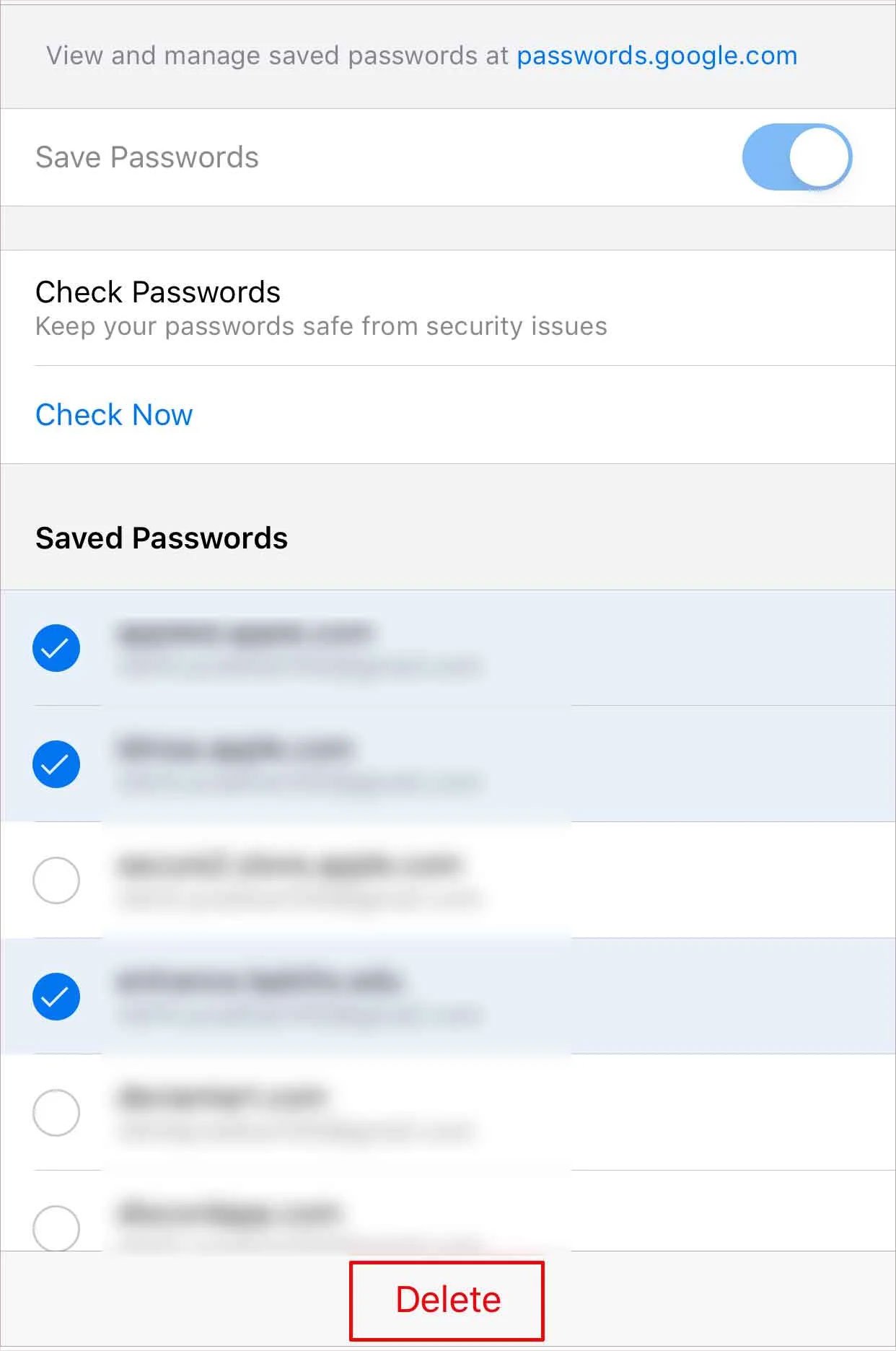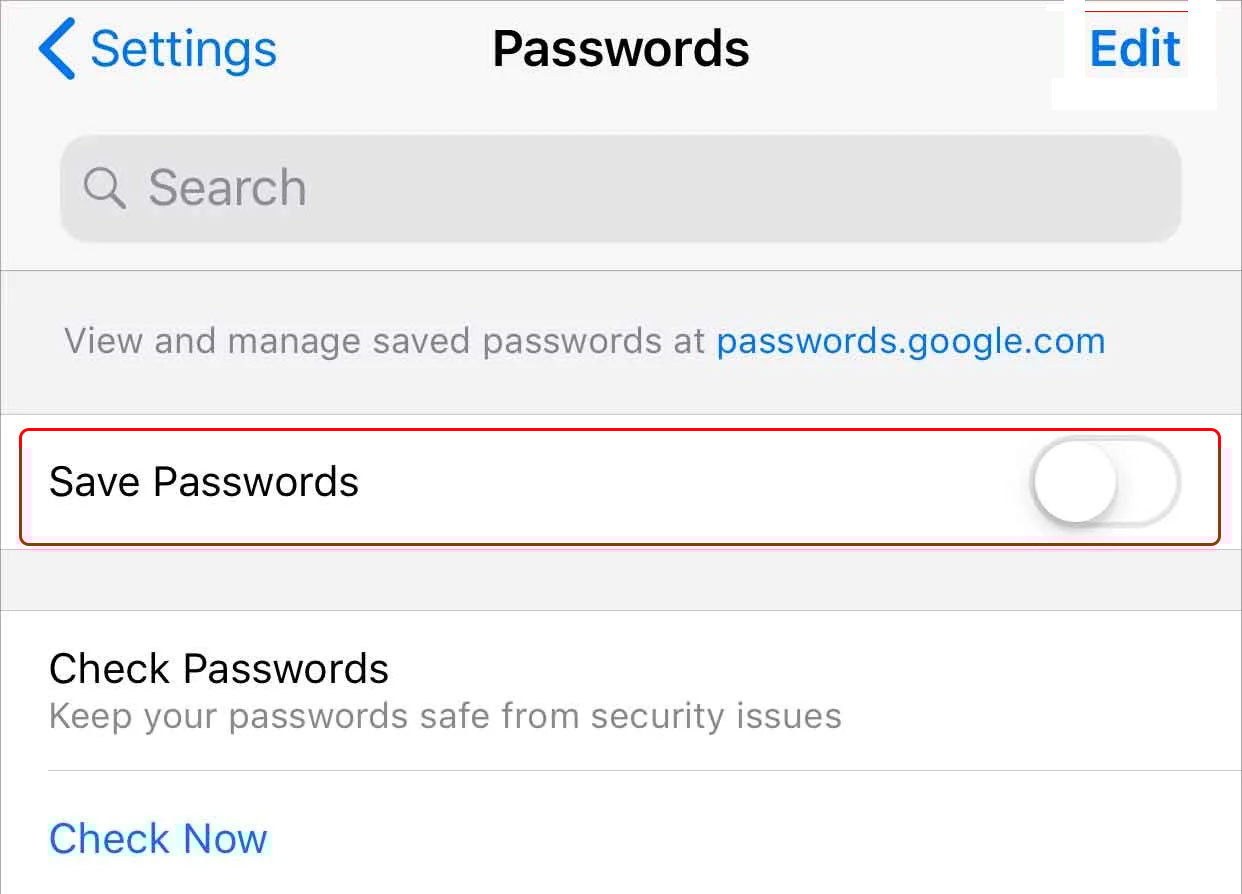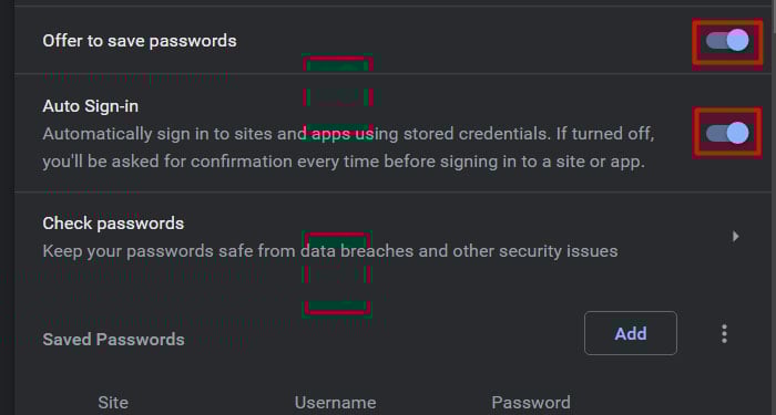 Desative as opções Salvar senhas e Login automático–in para as Senhas seção.