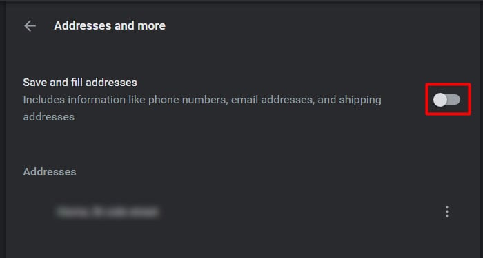 Para endereços e mais: clique em Endereços e mais. Desative Salvar e preencher endereços