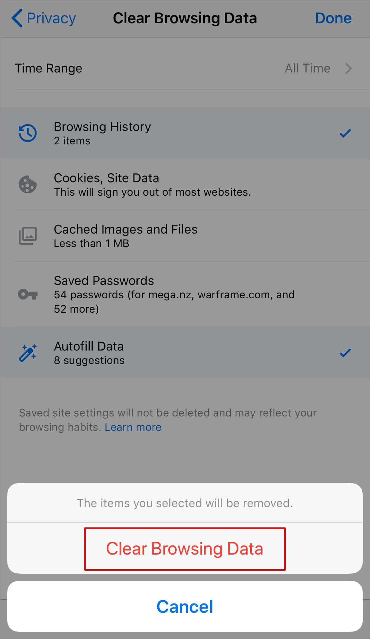 Toque em Limpar dados de navegação. Selecione Preenchimento automático de dados. Para Android, alterne para as guias avançadas e selecione Preenchimento automático de dados. Altere o intervalo de tempo para Todos os tempos e toque em Limpar dados de navegação.