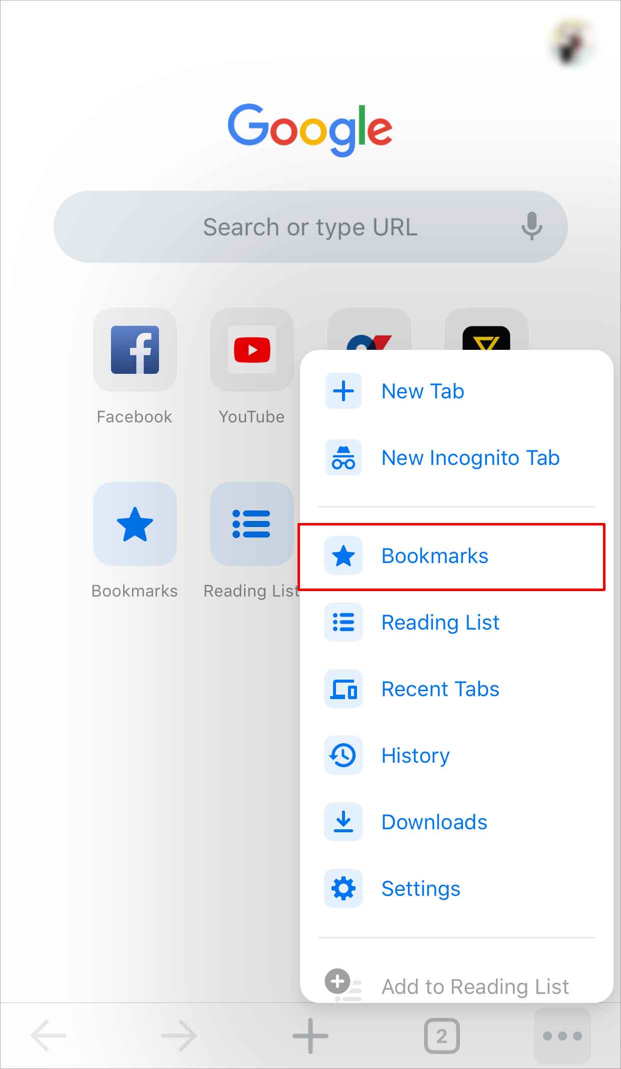 Abra o aplicativo Google Chrome.Toque no ícone de três pontos horizontais no canto direito do botão.Selecione Favoritos.