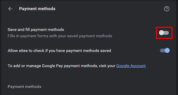 Desative Salvar e preencher métodos de pagamento para Métodos de pagamento. Desative Salvar e preencher endereços para Endereços.