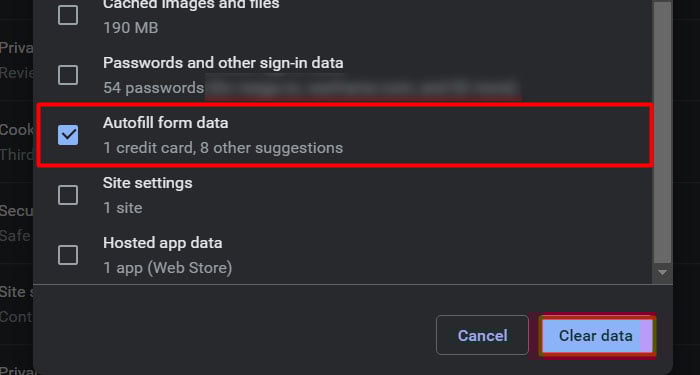 Certifique-se de que o Preencher automaticamente os dados do formulário está marcada. Você também pode selecionar a opção adicional para limpar marcando outras caixas de seleção.Clique em Limpar dados.