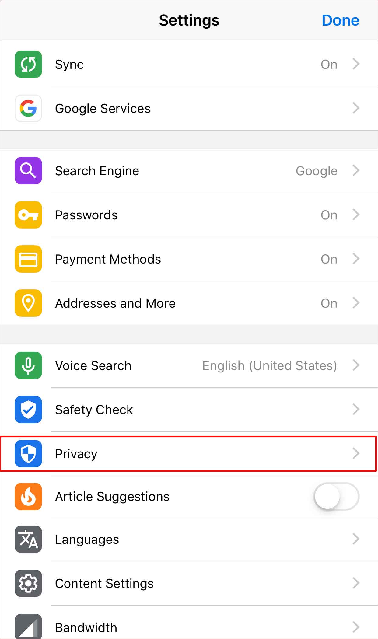 Você pode optar por remover as informações de preenchimento automático em Senhas, Métodos de pagamento e Endereços.