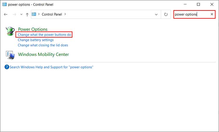 Após entrar no Modo de segurança, pressione a tecla Windows, digite Painel de controle e selecione-o.Na barra de pesquisa, digite Opções de energia .Escolha Escolha a função dos botões liga/desliga.