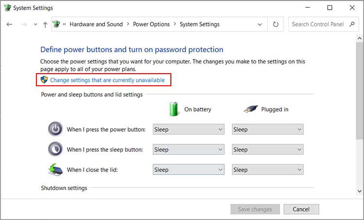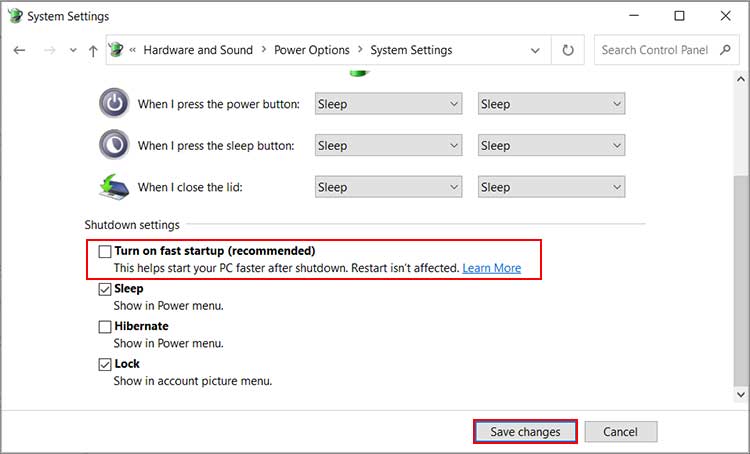 Agora, desmarque Turn na inicialização rápida (recomendado). Em seguida, pressione Salvar alterações.