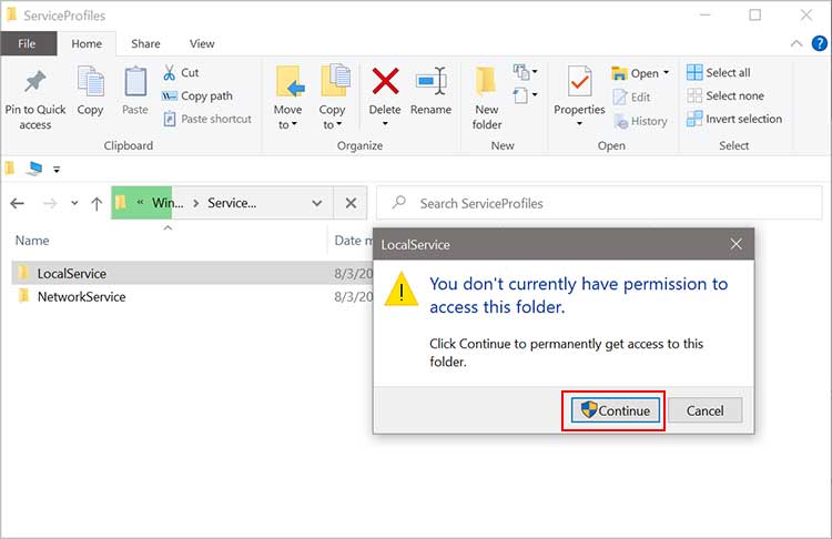Inicie seu PC no Modo de Segurança. Em seguida, pressione as teclas Windows + E e clique em Este PC.Abra C: > Windows > ServiceProfiles > LocalService. Pressione Continuar para continuar.