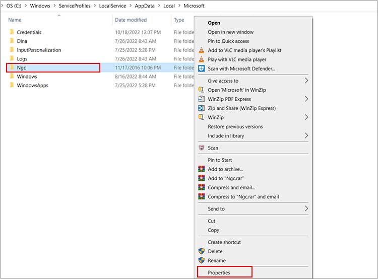 Clique duas vezes em AppData > Local > Microsoft. Agora, clique com o botão direito do mouse na pasta Ngc e selecione Propriedades.