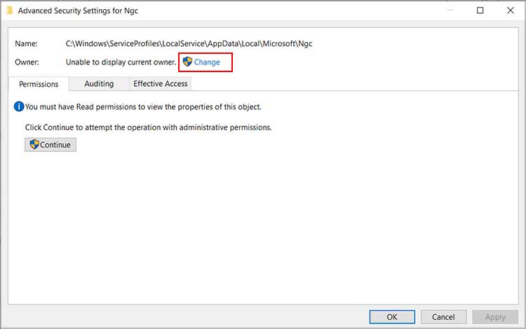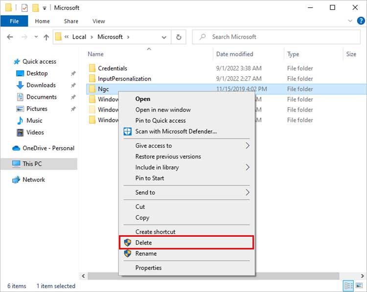 Vale a pena notar que, ao usar um PIN para fazer login no seu PC, o problema pode surgir devido à pasta Ngc. A pasta Ngc lida com todas as informações relacionadas ao PIN no computador. Se a pasta se tornar maliciosa, seu computador não poderá aceitar o PIN e ficará travado na tela do Windows. Portanto, você precisa remover esta pasta para se livrar do problema.