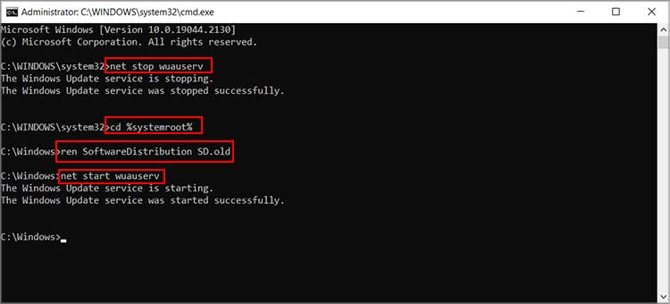 Execute os seguintes comandos um após o outro: net stop wuauservcd %systemroot%ren SoftwareDistribution SD.oldnet start wuauserv