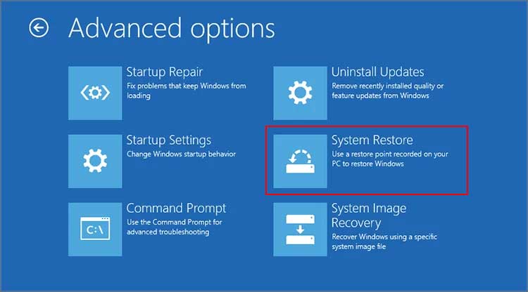 Abra o winRE no seu PC. Em seguida, selecione Solucionar problemas > Opções avançadas. Vá com a opção Restauração do sistema.