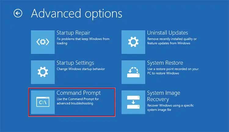 Abra o winRE no seu PC. Em seguida, escolha Solucionar problemas > Opções avançadas. Escolha o Opção Prompt de comando.