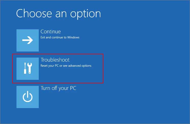 Inicie o winRE no seu PC. Selecione Solucionar problemas. Em seguida, escolha Redefinir este PC .