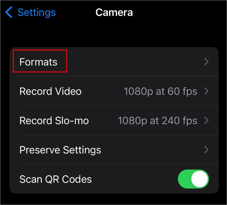 Abra Configurações no seu dispositivo. Vá para as configurações de Câmera . Clique em Formatos.