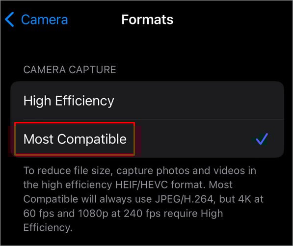 Por padrão, um iDevice salva as imagens capturadas no formato HEIC. Dito isto, você ainda tem a opção de definir o formato da imagem para JPG desde o momento em que clica na imagem. Para isso, você deve alterar as opções da câmera e definir o formato da imagem de’Alta compactação‘para’Mais compatível‘. E aqui estão as etapas para fazer isso: