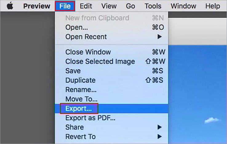 Clique duas vezes na imagem que deseja converter. Por padrão, a imagem será aberta no aplicativo de visualização. Em seguida, na barra de menus, clique em Arquivo > Exportar.