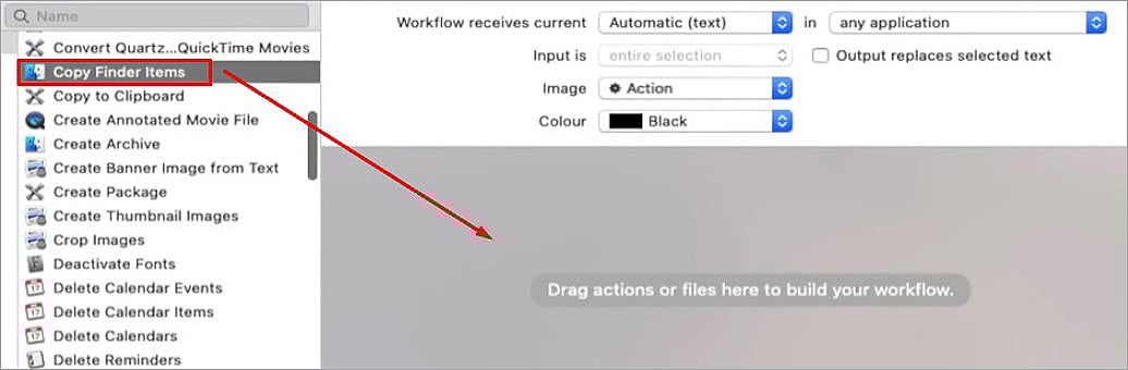 No campo de pesquisa na barra lateral esquerda, pesquise Copy Finder Items. Arraste e solte o resultado da pesquisa’Copy Finder Items >’para a posição especificada no lado direito da janela.
