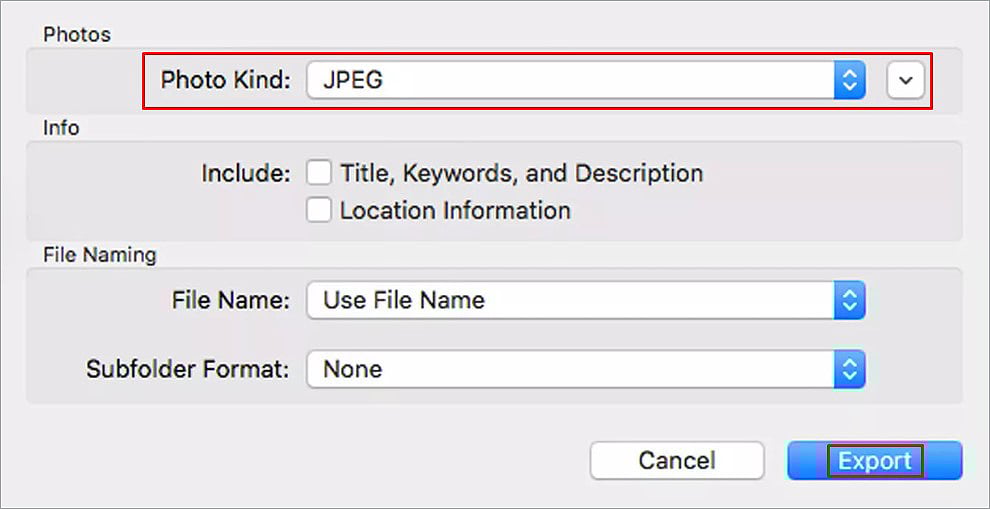 Defina o Tipo de foto como JPEG. Por fim, Exporte sua(s) imagem(ns).