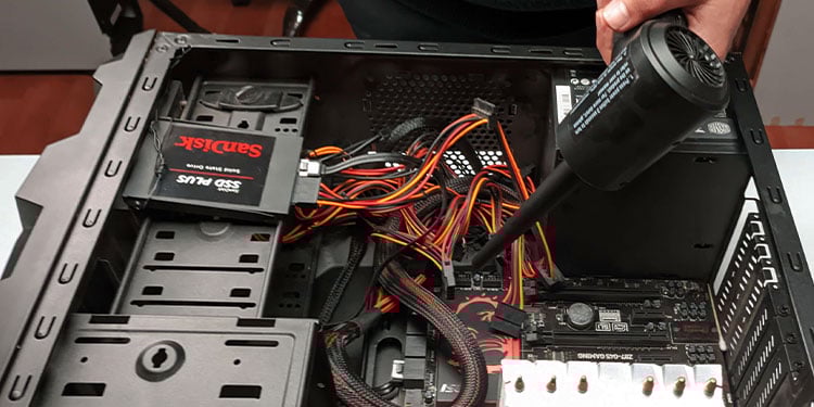 Aponte uma lata de ar comprimido na parte superior da parte interna do gabinete.