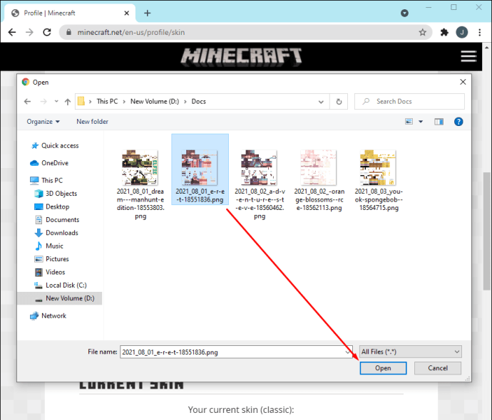 Vá para a pasta de downloads ou onde você armazena as capas. Selecione a capa que deseja usar. Clique em Abrir para carregar a capa em sua conta do Minecraft.