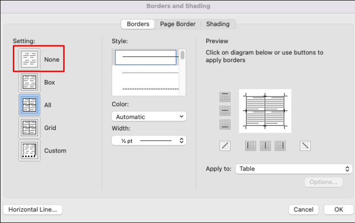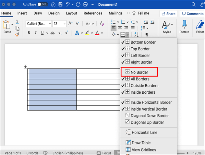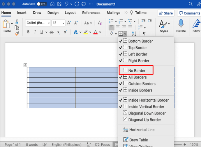 Selecione”Sem borda”no menu suspenso. Todas as bordas da tabela serão removidas.