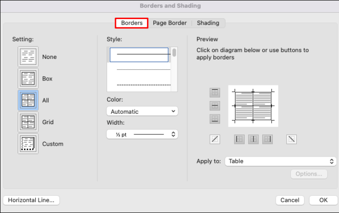 Uma caixa de diálogo será aberta. Selecione a guia”Borders”.