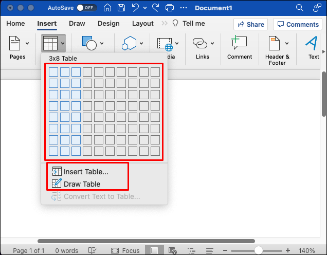 Mova o cursor sobre a grade para selecionar o número de linhas e colunas que deseja na tabela. Se quiser criar uma tabela grande, selecione”Inserir tabela”no menu suspenso e personalize o número de linhas e colunas.