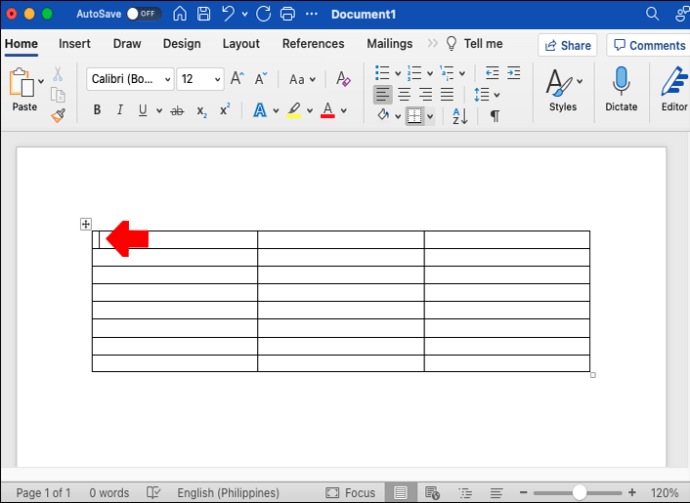 Depois de criar a tabela, clique na âncora na parte superior canto esquerdo da tabela até selecionar toda a tabela.
