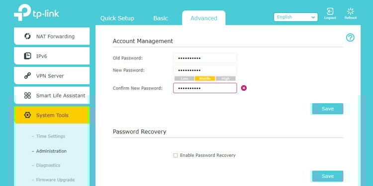 Depois que o roteador for redefinido e reiniciado, faça login na página de configuração do roteador Alterne para o modo Avançado se necessário. Em seguida, clique na guia System Tools, Administration ou similar. Altere o nome de usuário e a senha do roteador e salve as alterações.