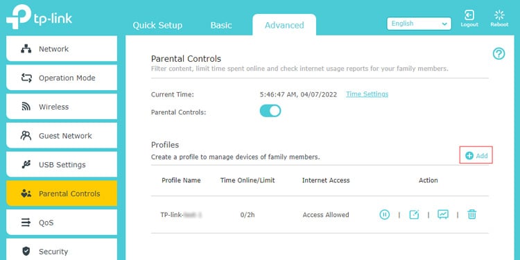 Para começar, faça login na página de configurações do roteador, como feito anteriormente.Alterne para a guia Controle dos pais. Isso deve estar acessível nos modos Básico e Avançado, desde que seu roteador seja compatível.Aqui, pressione o botão Adicionar para criar um novo perfil ou o botão Modificar para editar um existente.