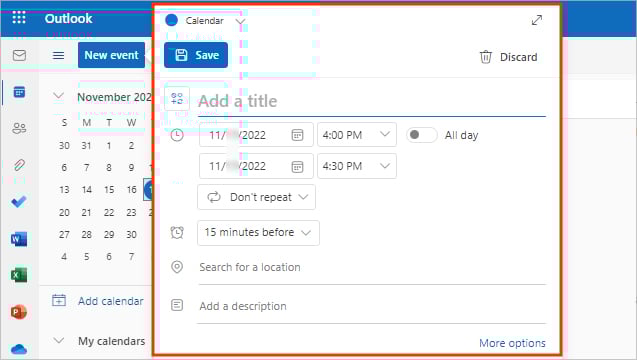 Abra um navegador e faça login em sua conta do Outlook.Selecione o ícone Calendário no canto superior esquerdo.Clique no botão Novo evento.
