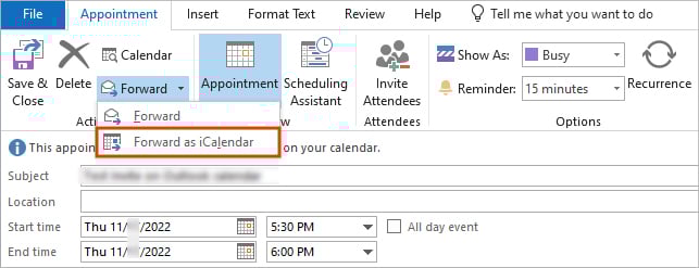 Na guia Compromisso, clique em Encaminhar e selecione Encaminhar como iCalendar.